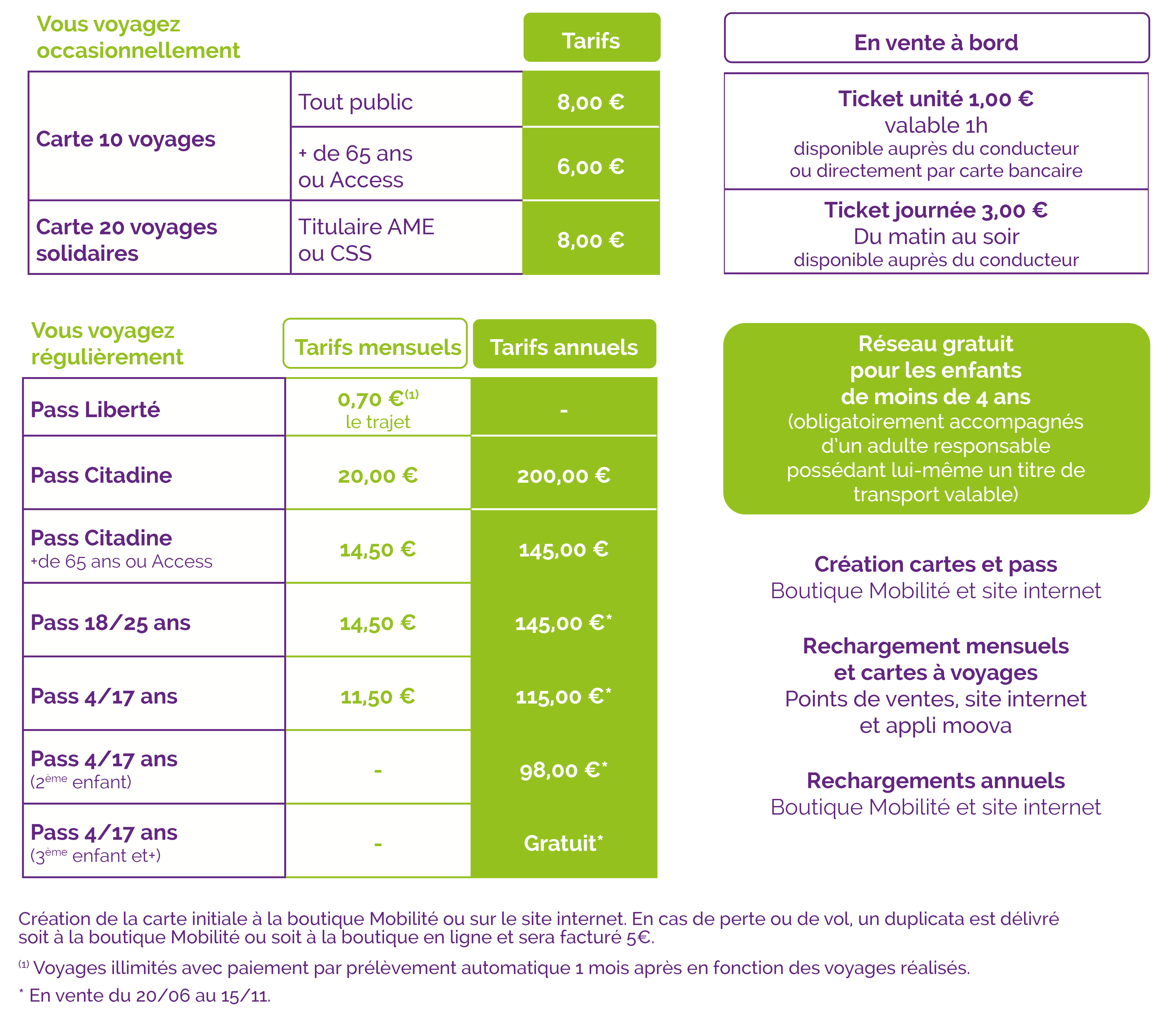 1 voyages, 10 voyages,... retrouvez tous les titres de transport moova en focntion de votre habitude de déplacement. Encore mieux, réglez votre ticket unité avec votre carte bancaire sans contact directement à bord de votre bus ! + d'information sur ce mode de paiement.
